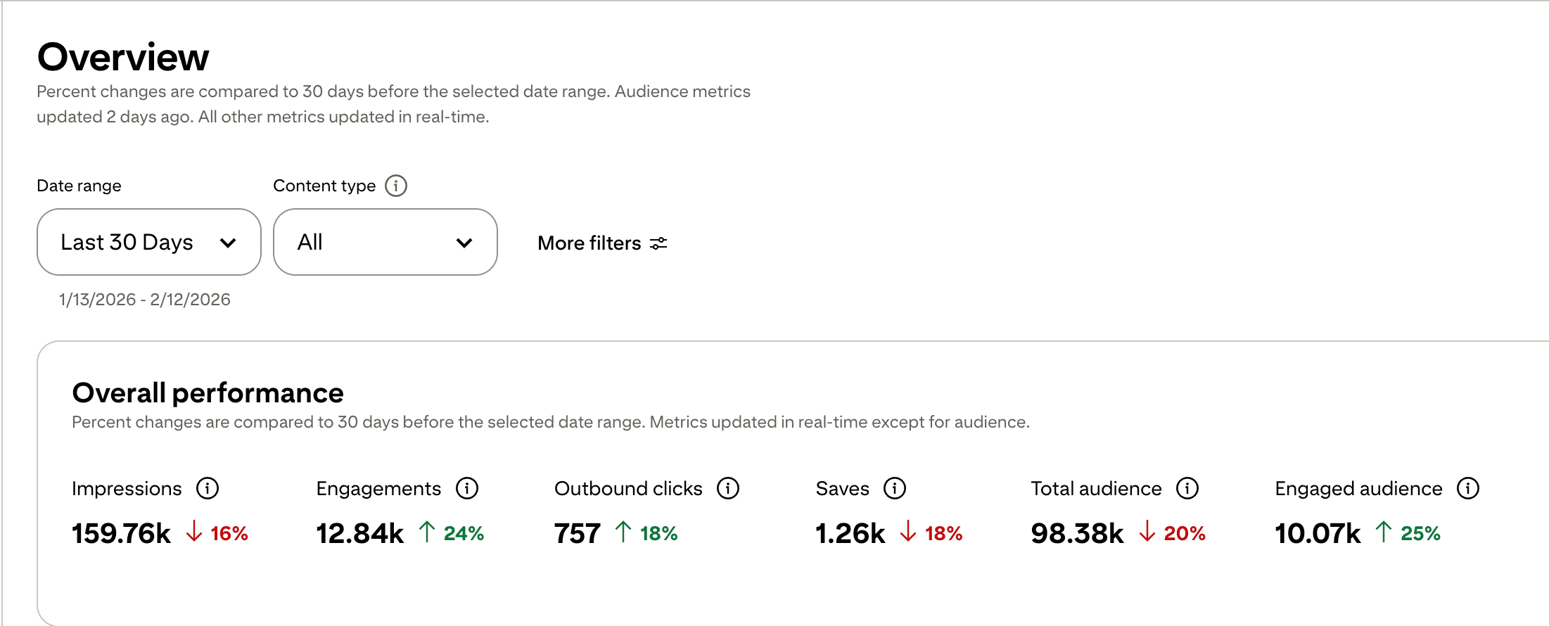 In the last 30 days alone, our Pinterest profile generated 159,760 impressions, 12,840 engagements, and 757 outbound clicks, with engagement up 24% and clicks up 18%.